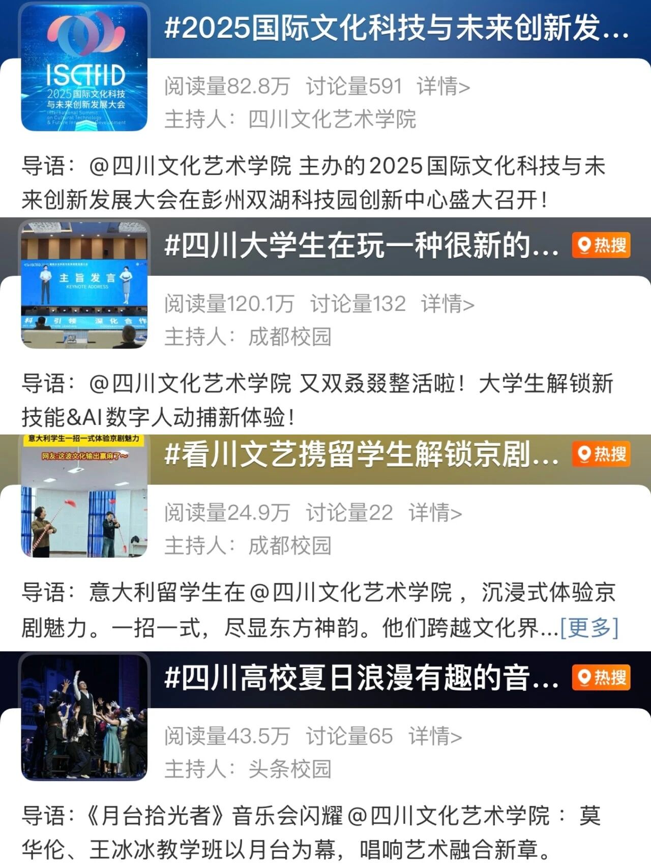 2025年,四川文化艺术学院的国际传播工作取得了可量化的显著成效。从2月到12月,学校共推动策划了20个相关热搜话题,这些话题累计获得592.2万次阅读,引发7562次互动和2553次讨论。