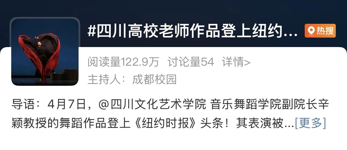 4月,舞蹈学院副院长辛颖教授的舞蹈作品登上《纽约时报》头条,其表演被赞誉为“超越凡俗且充满英雄气概”。这一成就通过话题“#四川高校老师作品登上纽约时报#”传播,获得了122.9万的阅读量。