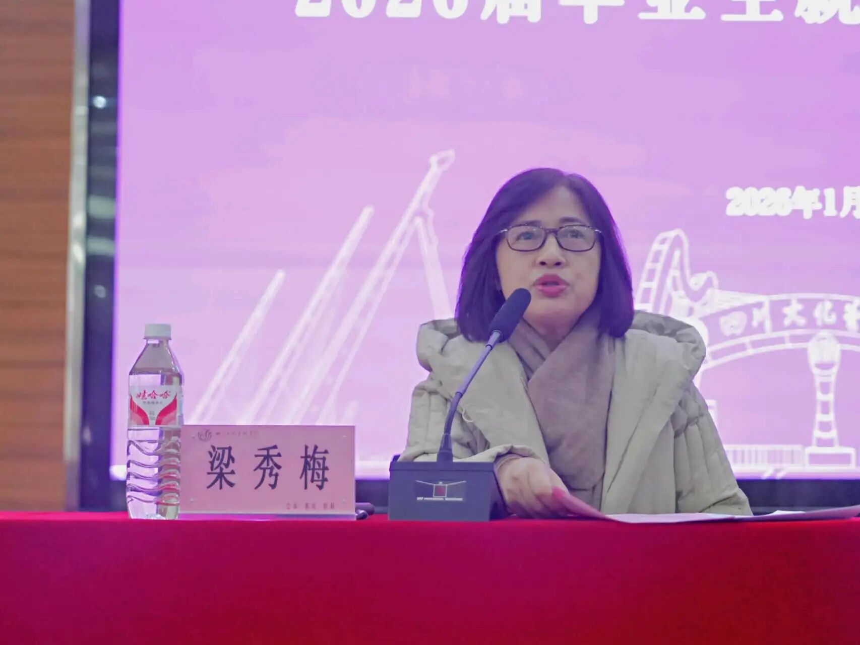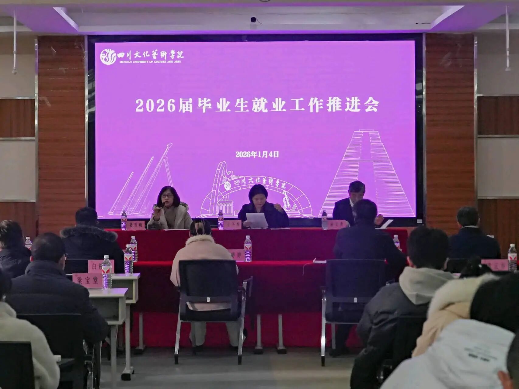 为深入贯彻落实党的二十届四中全会关于促进高质量充分就业的决策部署,进一步统一思想、凝聚合力,切实推动学校就业工作提质增效,1月4日上午,四川文化艺术学院在绵阳校区E栋105会议室召开2026届毕业生就业工作推进会。学校理事会全体理事、校委会全体成员、党委会全体委员,各二级学院、各职能部门、集团公司中层以上干部,就业专项工作督查小组成员,就业中心全体人员及2026届毕业生辅导员、各二级学院就业工作联络员参会。执行校长梁秀梅主持会议。