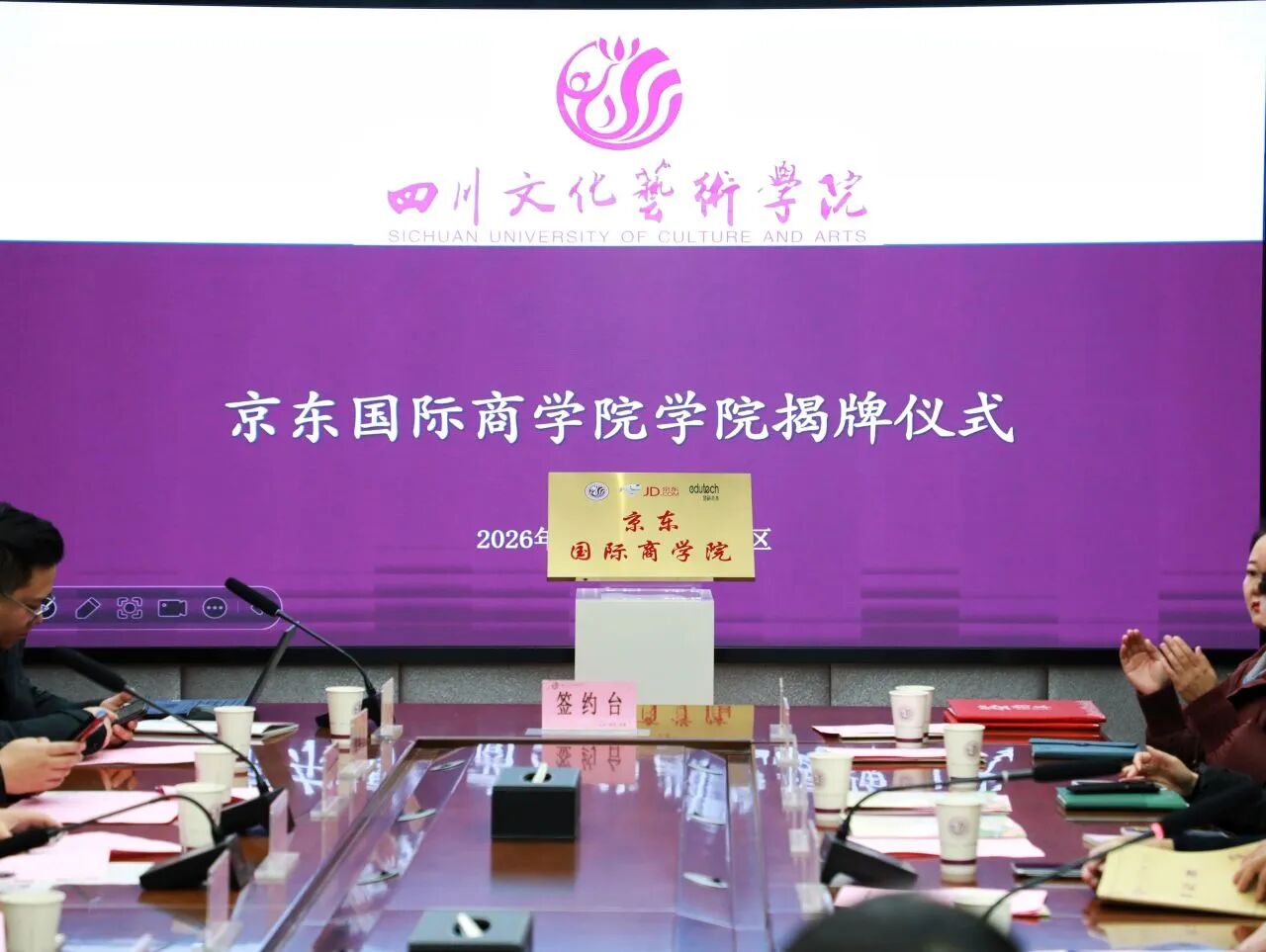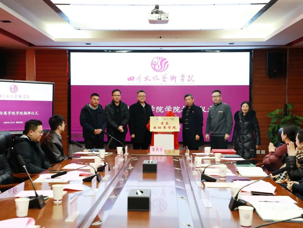 2026年1月5日,四川文化艺术学院与京东集团共建“京东国际商学院”签约暨揭牌仪式在绵阳校区举行。学校副校长杨文勇、副校长胥烈勋,京东集团公共业务副总裁栾世杰、物流科技副总裁范广辉,慧科未来总经理王丹枫、副总经理钱晖中等出席仪式。签约仪式由副校长胥烈勋主持。
