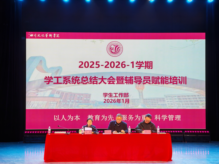 为深入贯彻立德树人根本任务,全面总结本学期学生工作成效,夯实辅导员队伍专业化建设根基,2026年1月5日上午9:30,我校学生工作部在绵阳校区多功能厅举行了2025-2026-1学期学工系统总结大会暨辅导员赋能培训。副校长张大汉出席会议并讲话,学生工作部班子成员、各二级学院党总支及直属党支部书记、副书记,学生工作部全体人员及全体辅导员参加了本次大会。大会由学生工作部副部长陈娜主持。