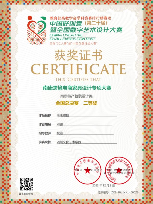 近日,在第20届中国好创意设计大赛国赛的南康跨境电商家具设计专项赛中,我校数智设计学院视觉传达设计专业师生凭借出色的创意与扎实的专业技能,脱颖而出,取得优异成绩。在“南康特产包装设计”赛道中,数智设计学院2022级视觉传达设计本科2班学生刘丽,凭借其作品《南康甜柚》荣获全国总决赛二等奖。该作品围绕南康本土特色产品进行包装创意设计,充分展现了南康特产的独特魅力,有效提升了本土特产的品牌价值与市场吸引力。同时,指导教师魏艳荣获“优秀指导教师”称号。